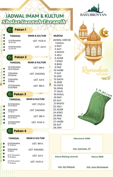 Kami mengajak seluruh jamaah dan masyarakat untuk senantiasa berpartisipasi aktif dalam setiap kegiatan yang diselenggarakan oleh DKM Baiturroyyan. Dukungan dan kebersamaan kita semua akan menjadi kekuatan besar dalam memakmurkan masjid dan mempererat ukhuwah Islamiyah.
